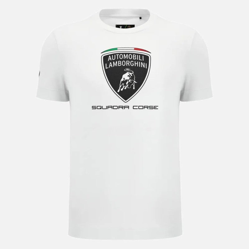 The Automobili Lamborghini Squadra Corse men's white sports T-shirt guarantees unparalleled freedom of movement thanks to its stretch fabric. The ribbed collar adds a casual touch while maintaining a clean line. This garment integrates easily into any wardrobe, offering a simple yet detailed style with the Automobili Lamborghini Squadra Corse logo applied in the center.